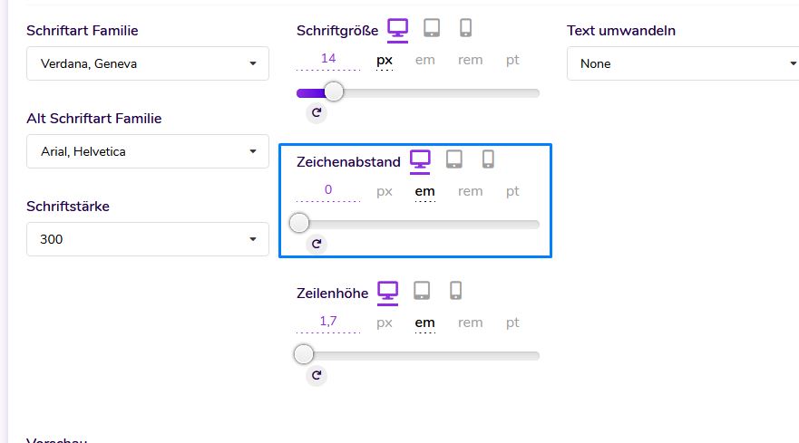 With the template frameworks, you can specify different font sizes, letter spacing and line heights for different device sizes.
